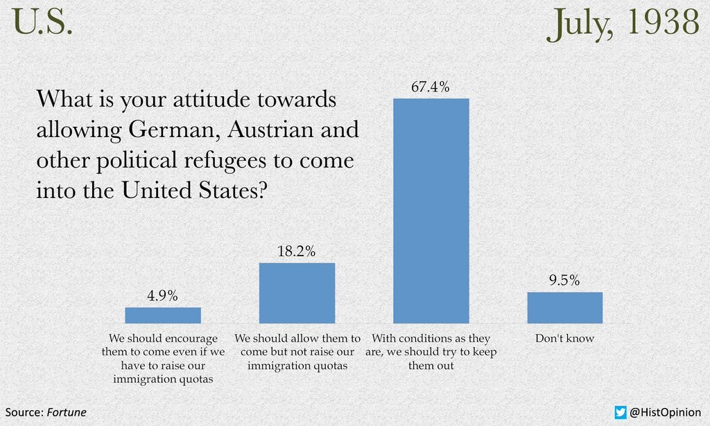 At the time, that wasn’t unusual. Most Americans didn’t want to accept Jewish refugees from Germany because they thought Jews were Communists who would seek to control America and diminish it’s base identity as a Christian country. An American Institute of Public Opinion poll showed that nearly 70% of Americans thought the United States should actively prevent Jewish refugees from entering the country. As much as we’d like to think of our country as a beacon of hope to immigrants, Americans have traditionally feared and disparaged whatever group represented the current majority demographic seeking to enter our borders, from the Irish in the 1800s to Italians, to Eastern Europeans to Hispanics to Muslims. And all of them have been saddled with the claim that they were out to harm us in some way or another.